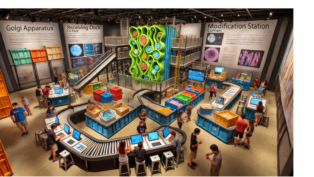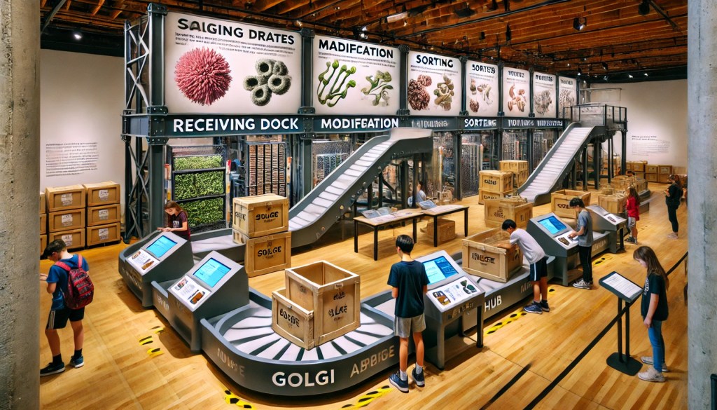 Students navigate a warehouse-inspired museum exhibit, simulating the Receiving Dock (Cis Face), Modification Station (Lumen), and Sorting Hub (Trans Face) of the Golgi Apparatus.